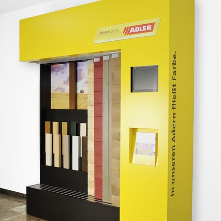 Avec les éléments de magasin Protected by ADLER, le conseil en fenêtres devient une expérience. On y trouve non seulement des échantillons de surfaces de fenêtres revêtues de différents revêtements, mais on peut aussi les combiner avec divers échantillons de façades. Un véritable entretien-conseil peut avoir lieu sur ces modules de point de vente. Le client voit l'effet que produira la fenêtre dans sa maison, comment elle encadrera la vue et, surtout, il peut essayer la sensation qu'elle procure. Ce n'est alors pas le prix qui décide à la fin, mais justement le sentiment - car les fenêtres en bois "protected by ADLER" sont tout simplement à aimer.