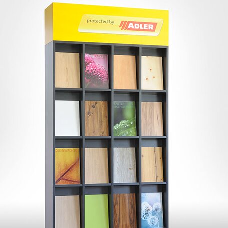 Le présentoir a été spécialement conçu pour présenter un grand nombre de surfaces d'échantillons dans un espace aussi réduit que possible. Sur un mètre de large et deux mètres et demi de haut, il est possible d'exposer un total de 16 planches d'échantillons A4. Dans la partie inférieure, il y a encore de nombreux compartiments coulissants pour d'autres surfaces. Le présentoir peut être placé au mur ou utilisé comme élément indépendant. Pour cela, deux motifs d'image différents sont disponibles pour le verso.