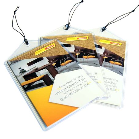 Ces étiquettes pratiques peuvent être fixées au meuble dès qu'il est terminé. Ils sont munis d'un élastique et sont donc faciles à mettre en place. Les étiquettes pour meubles contiennent des conseils d'entretien utiles pour les surfaces en bois huilées, cirées et vernies. Le dépliant de quatre pages est petit, maniable, clair et attrayant. Il met en valeur chaque meuble et fournit en même temps des informations importantes.